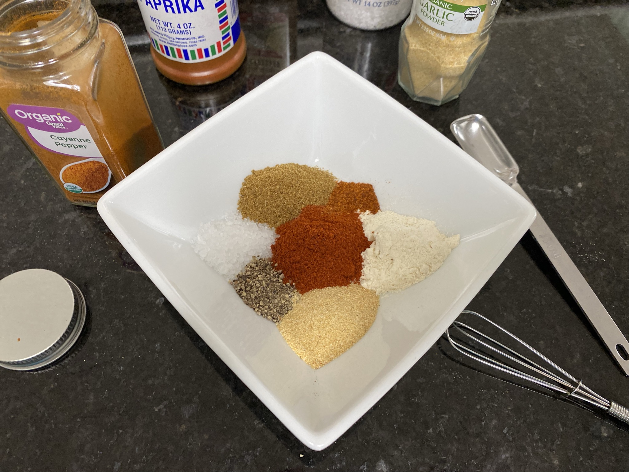- In a small bowl combine the dry rub spices; sea salt, black pepper, smoked paprika, onion powder, garlic powder, cumin, and cayenne pepper. Stir to blend.